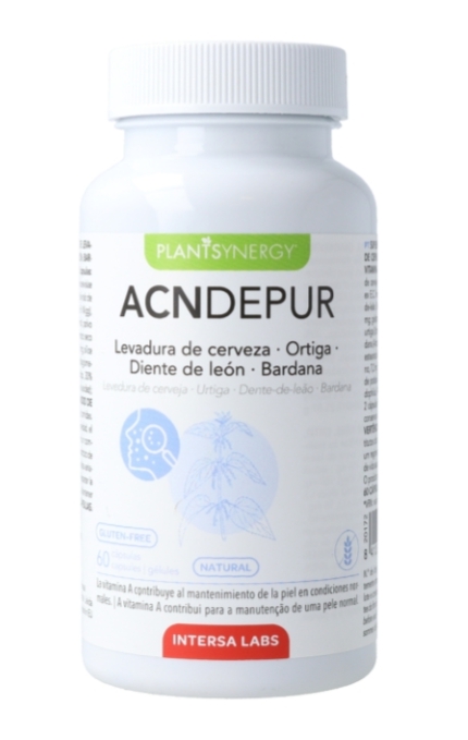 Acn Depur Acne de Intersa es un suplemento que colabora en la depuración orgánica en tratamientos del los trastornos de la piel y otras afecciones dermatológicas. Contiene levadura de cerveza viva, vitamina A, diente de león, ortiga verde, bardana y lactobacilos. La vitamina A contribuye al mantenimiento de la piel en condiciones normales.