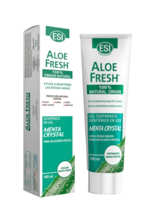 Aloe Fresh Gel Menta Cristal de Trepatdiet Esi es un dentífrico en gel de Origen Natural y acción Retard, contiene una combinación única de ingredientes naturales activos. Para una sonrisa fresca y brillante, además de prevenir y combatir el mal aliento. Ayuda a mantener la encías sanas. Protección natural contra la placa, sarro, mal aliento, caries y manchas.