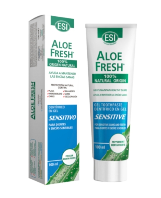 Aloe fresh sensitive es un gel dental formulado a base de componentes 100% naturales con aloe vera y extracto de algas marinas, que ayuda a mantener enci?as sanas. Formulado especialmente con extractos vegetales para el cuidado de las enci?as sensibles y delicadas. Con xilitol, que restablece el pH normal de la cavidad bucal ayudando a prevenir la aparicio?n de caries y enfermedades de la enci?as. El uso diario, garantiza el mantenimiento de una buena higiene bucal, con una accion delicada, sin agredir el esmalte y preservando el cuidado y mantenimiento de unas enci?as sensibles y delicadas.